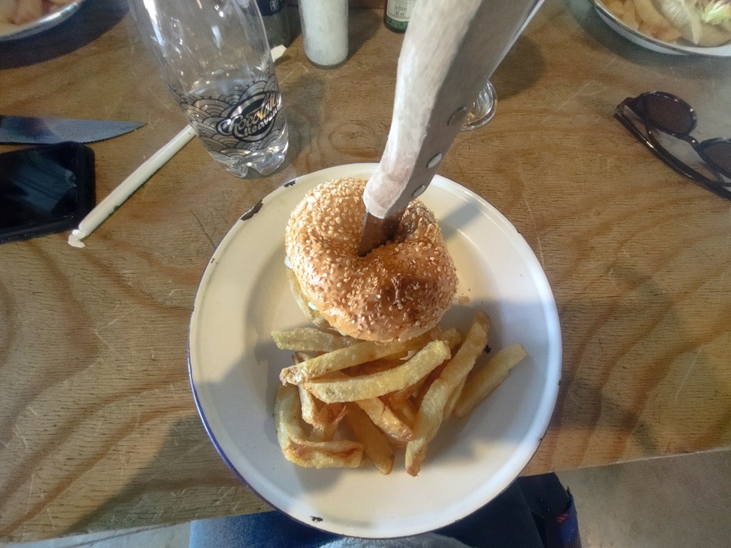 Jeremy ordered the double smash burger and Nate and I had the single smash burger. They were all presented with a big steak knife struck down the middle. Nate also bought a carrot cake jam which was exceptionally tasty on a sweet potato bread we bought from the local Spar.